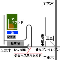 東京方面から来る場合、 新大宮バイパスで 田島交差点の所を 側道(本線はアンダーパス)に入り 田島交差点を左折 (大宮方面から来る場合は右折) 3つ目の信号(公園入口案内板あり)を 右折すると 園内に入ります。 ヘアピンカーブを曲がり、 橋を左手に見つつ、 両側に駐車場が見えて来たら、 その付近に停めてください。